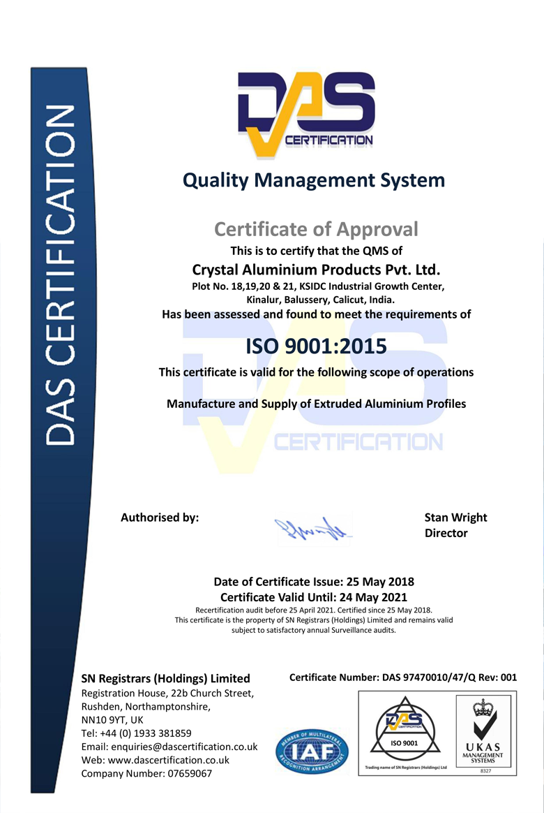 We are one of the “MALABAR GROUP OF COMPANIES” located in Kinalur Industrial Growth Estate near Calicut Kerala spanning 2 ½ Acres of land. The company operate with 3 imported aluminium extrusion press lines of 7” and 4” containers with an installed capacity of 6000 MT per year and is capable to meet any additional requirement of the market. With the state of the art manufacturing unit and most modern laboratory and testing facilities we are fully committed to setting the industry standard and have been accredited with ISO 9001 – 2015 quality management system which comprises all of our ongoing services and product developments. The unit designs, provides and fixes a complete solution of the needs of architects, builders, and consultants for high-class door, window, partition, and structural glazing etc.
